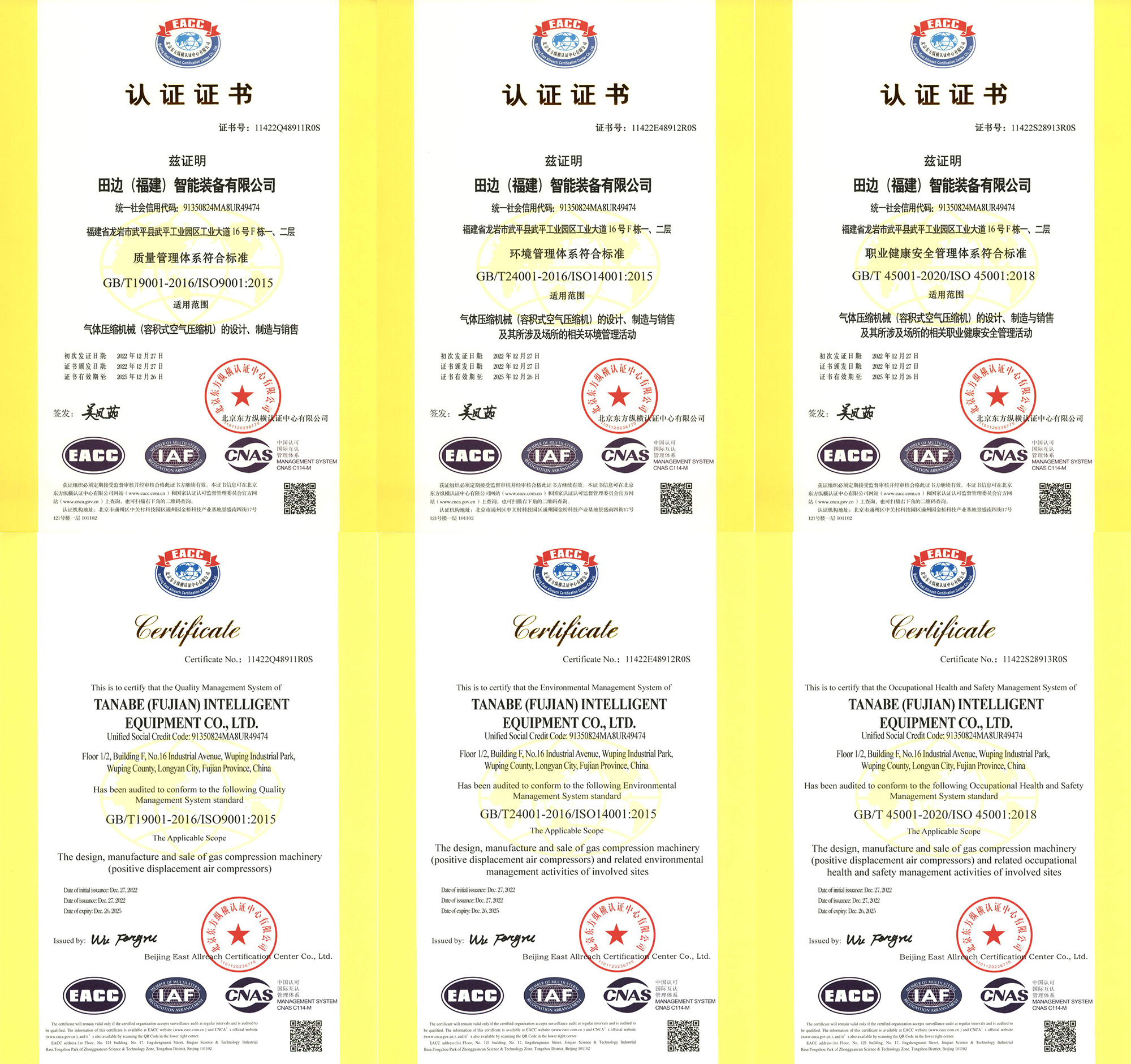 日前,开云官方官网登录入口一举通过GB/T 19001 / IOS 9001质量管理体系认证、GB/T 24001 / ISO 14001环境管理体系认证和GB/T 45001 / ISO 45001职业健康安全管理体系认证,并获得三标证书和一般用(变频/工频)喷油螺杆式空气压缩机GCCA产品质量安全认证。