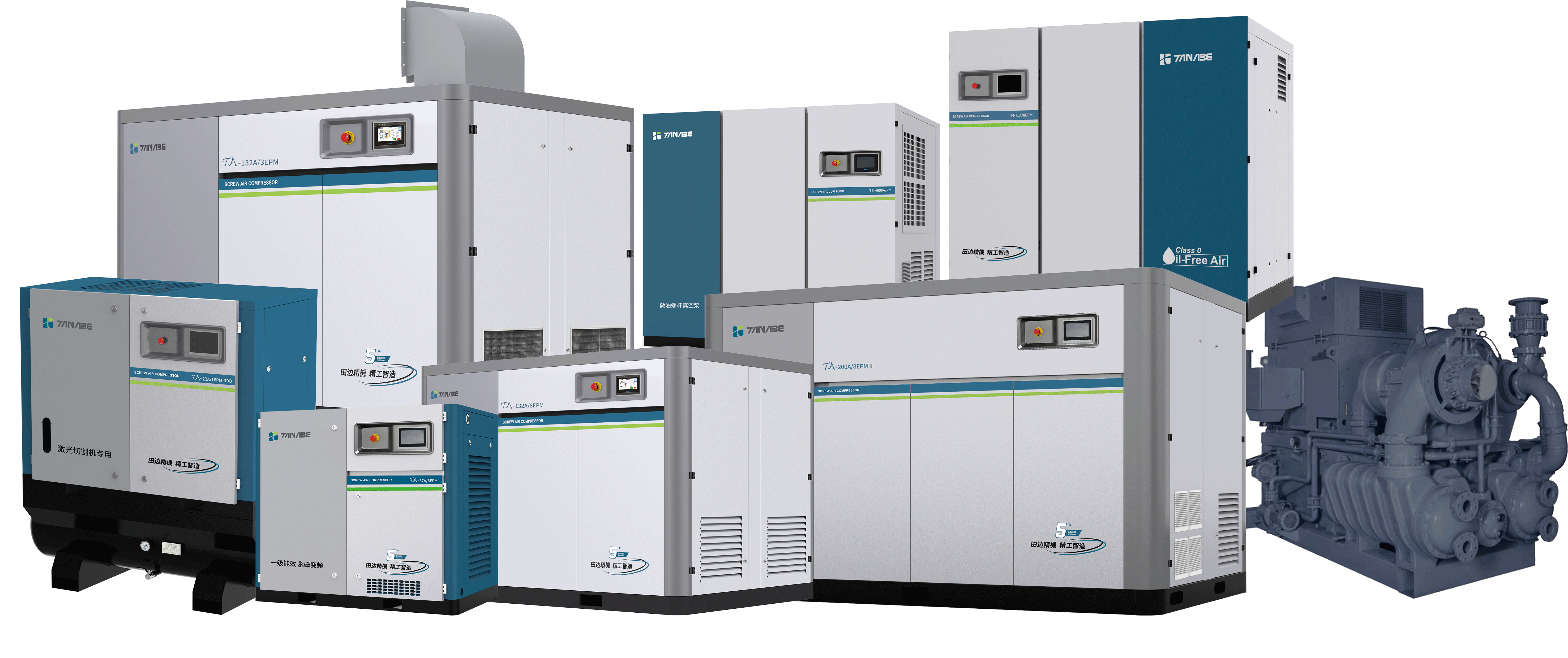 TA系列永磁(工)变频单双级螺杆空气压缩机,TN系列干式无油螺杆式空气压缩机,TB系列微油螺杆真空泵,激光切割机专用空压机,离心压缩机,低压鼓风机等多款高效节能产品